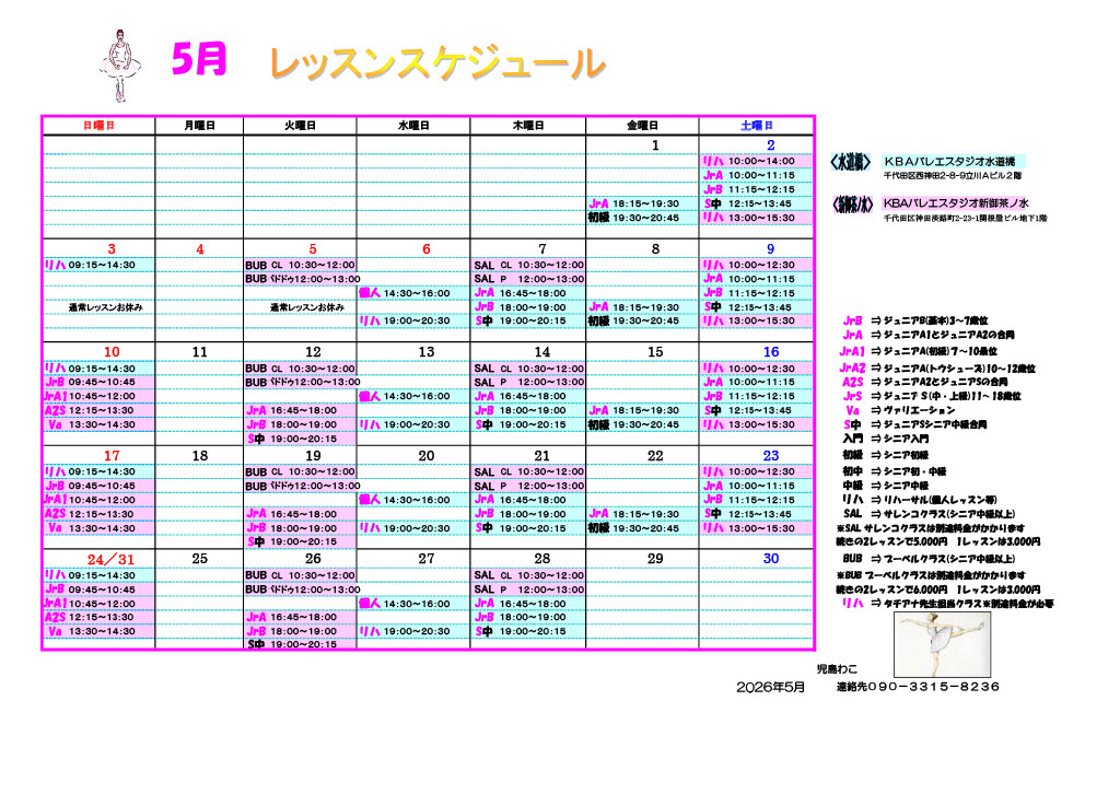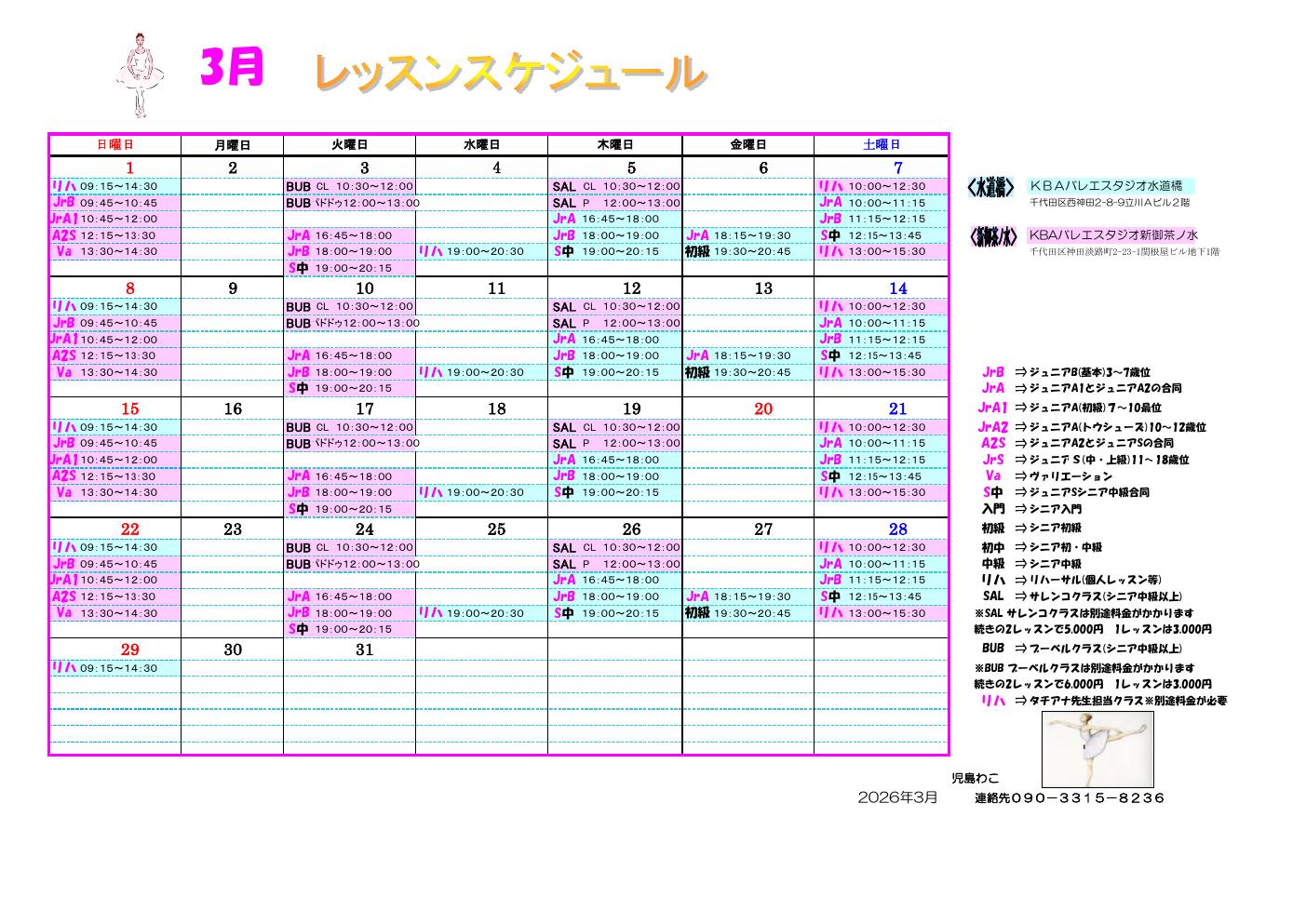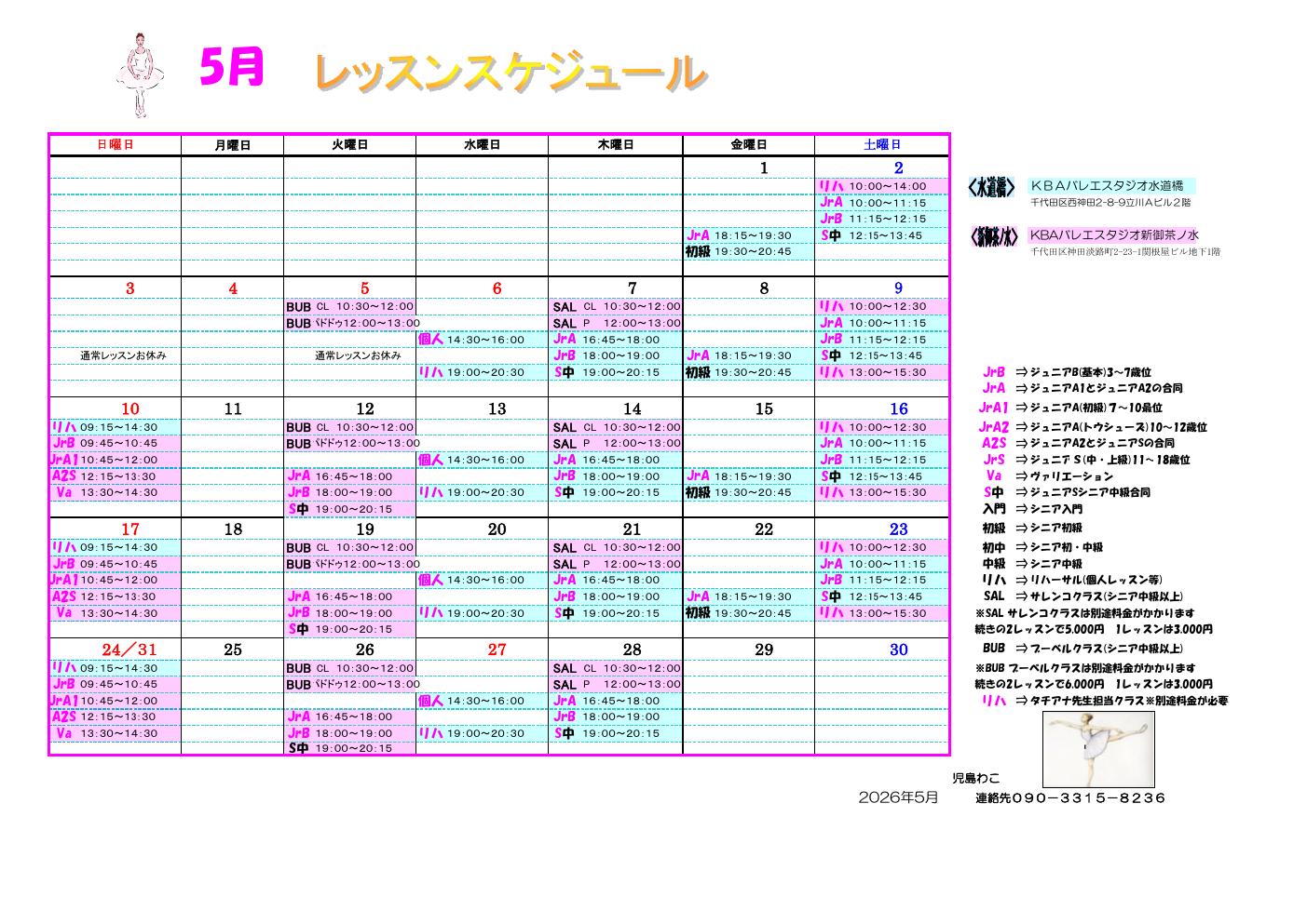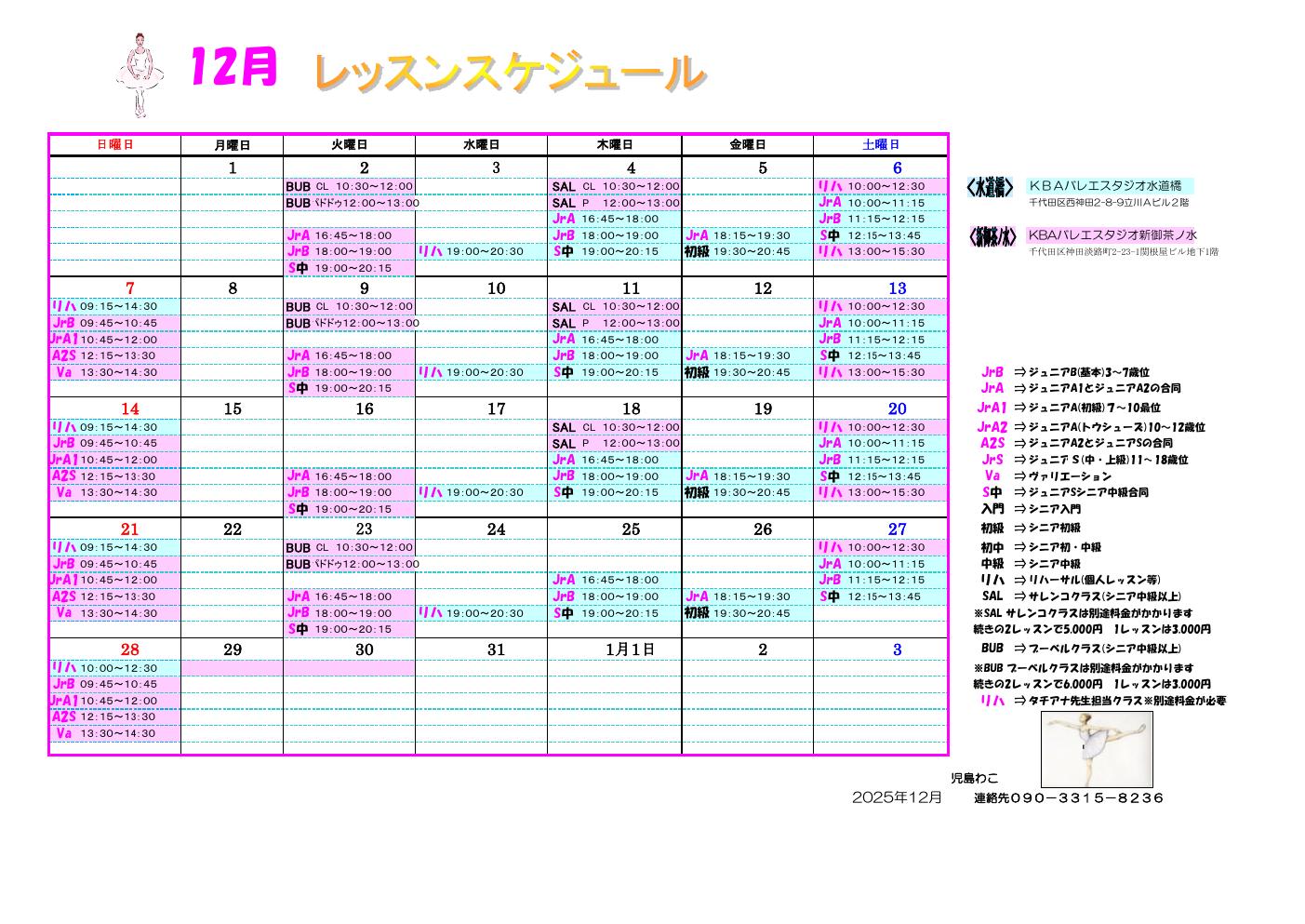※レッスン日は変更される場合があります。必ずその月のレッスンスケジュール表を確認してください。